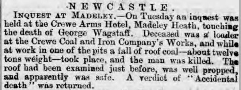 Both Thomas and Catherine’s parents and parent’s parents are, of course, also coal miners…but there are a couple of other interesting nuggets of information here. Thomas’s father, George Wagstaffe, who is my great great great great grandfather not only worked in a mine but perished in one too. Now, coal mines are dangerous places so maybe some of my other ancestors died in mining accidents as well, but for George I have the receipts! Whilst he was working as a loader in one of the pits (coal mines) owned by Crewe Coal and Iron Company he was crushed underneath about 12 tonnes of coal. An inquest was held where they decided it was an accident and that whole incident made the papers. How awful though? It gives me shivers to think of it. …and also, how awful to have been the man that checked the props and declared the tunnel as safe?