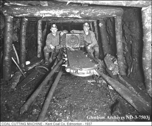Dorothy Amy’s ancestors were largely nailers (people who made nails), and even though I haven’t quite managed to finish this line yet, I can tell you now that my great grandfather’s ancestors were overwhelmingly coal miners. My great grandad Bill was the most recent coal miner on my family tree and it makes sense to start with him. William Henry Wood was born in Belper in 1908 and is frustratingly difficult to find records for! But what I can tell you is that he is listed as being a ‘colliery coal cutting operator below’ in the 1939 census. Let’s unpack that for a second. So, a colliery is a coal mine, which means a collier is a coal miner, and in lots of the census records I read they specify whether the miner worked above ground or below by just writing the job and then adding the caveat ‘above’ or ‘below’. Having not worked in a coal mine myself and being unfamiliar with the workings, I googled for images of coal cutting machines around the 1940s and the results are pretty much as bleak as I imagined (see image below)! I couldn’t find any more official records of his mining activities, but my grandad remembers him working with the classic mining tools of pickaxe and shovel and that he came home covered in coal dust from his job at the Denby colliery in Derbyshire. My mum has fond memories of him telling her as a child that he’d been mining below the house that day (her parents and grandparents lived next door to one another). I mean, that obviously wasn’t true, but it’s really very sweet!