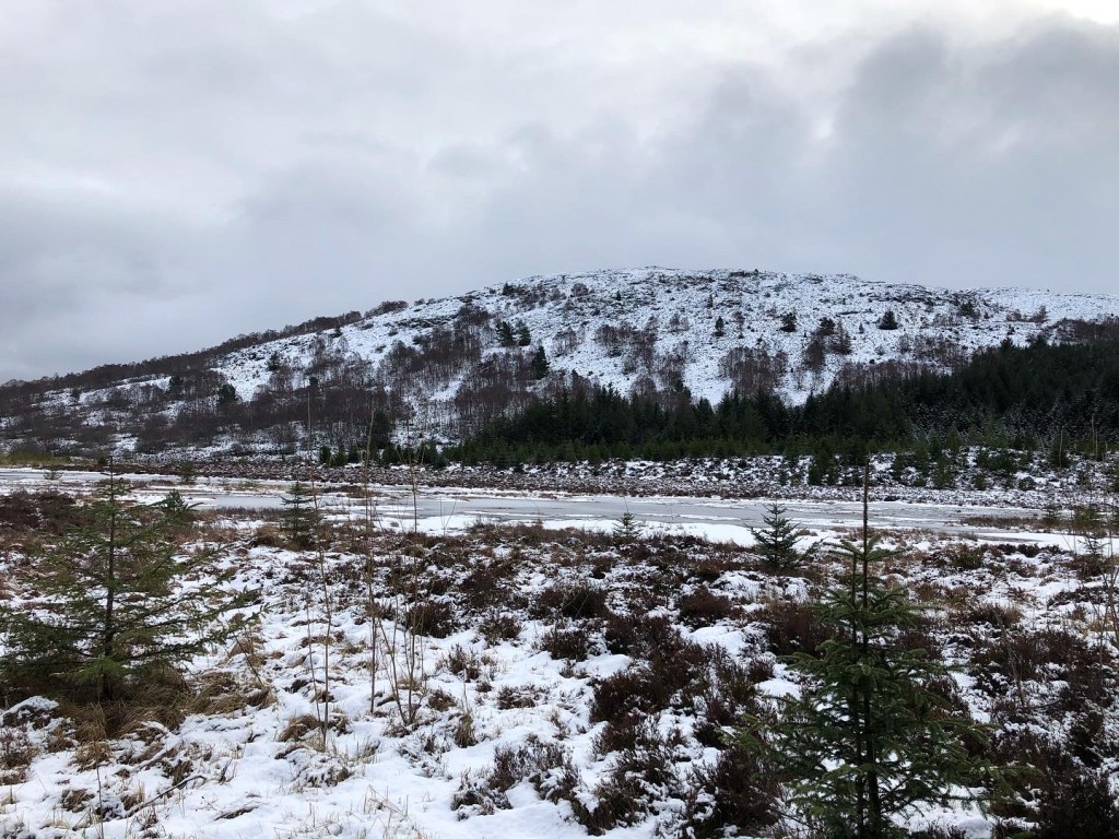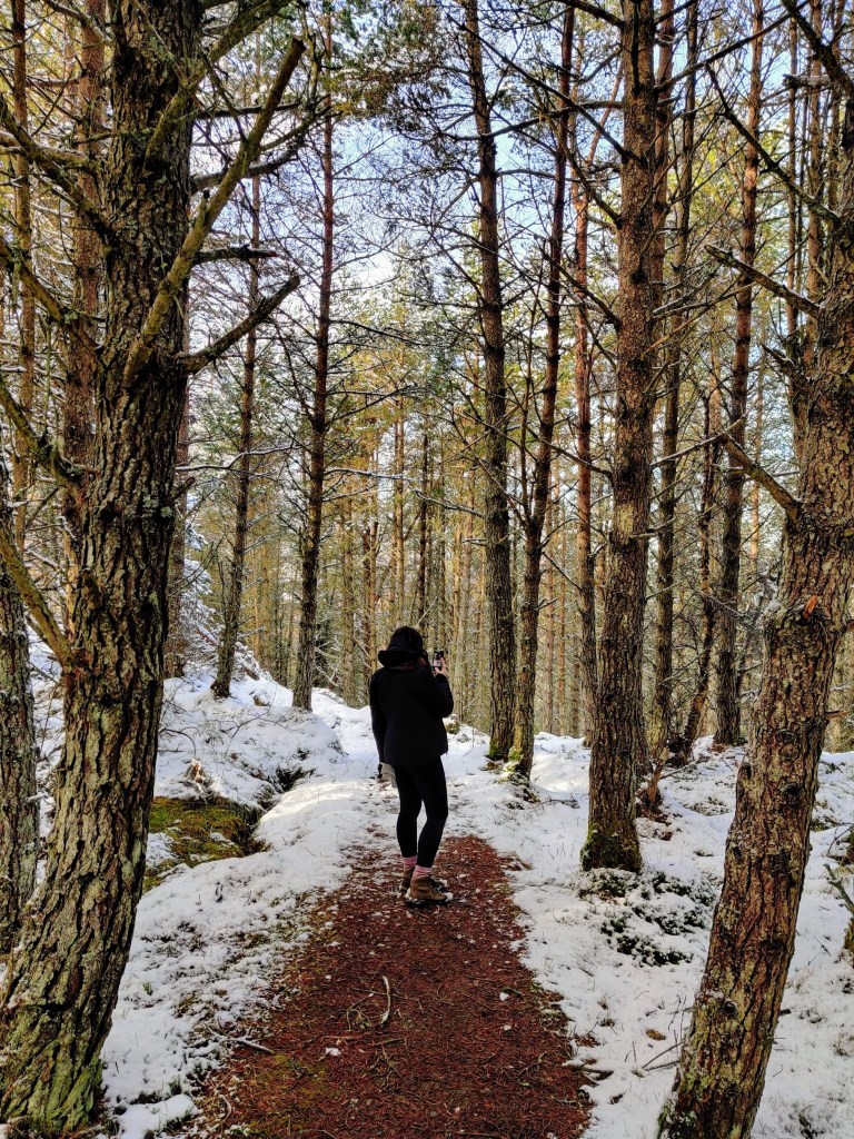 With me still chattering away about the birds and clutching onto my binoculars hoping to see more we headed off up the hill to the 434 metre summit of Carn na Leitire. We stopped via the pond to poke the ice, at the Lochside bird hide to see if we could spot anything, at the bronze age hut to talk about what people would’ve dressed in back then to stay warm and in the forest a couple of times because we were tired!