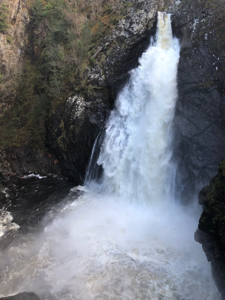 After our Farigaig lunch we followed the ‘Walk Highlands’ route to Foyers Falls, down to the shores of Loch Ness and then back to the car through the village of Foyers. The falls were epic! We’d been told with a grunt earlier in the day that they weren’t that impressive, but they blew us away. The falling water was so powerful that as we approached them I thought someone was having a bonfire, the spray of water being forced upwards looked like smoke. In fact, the Gaelic name for the falls, Eas na Smùide, means the smoking falls…I can totally see why.